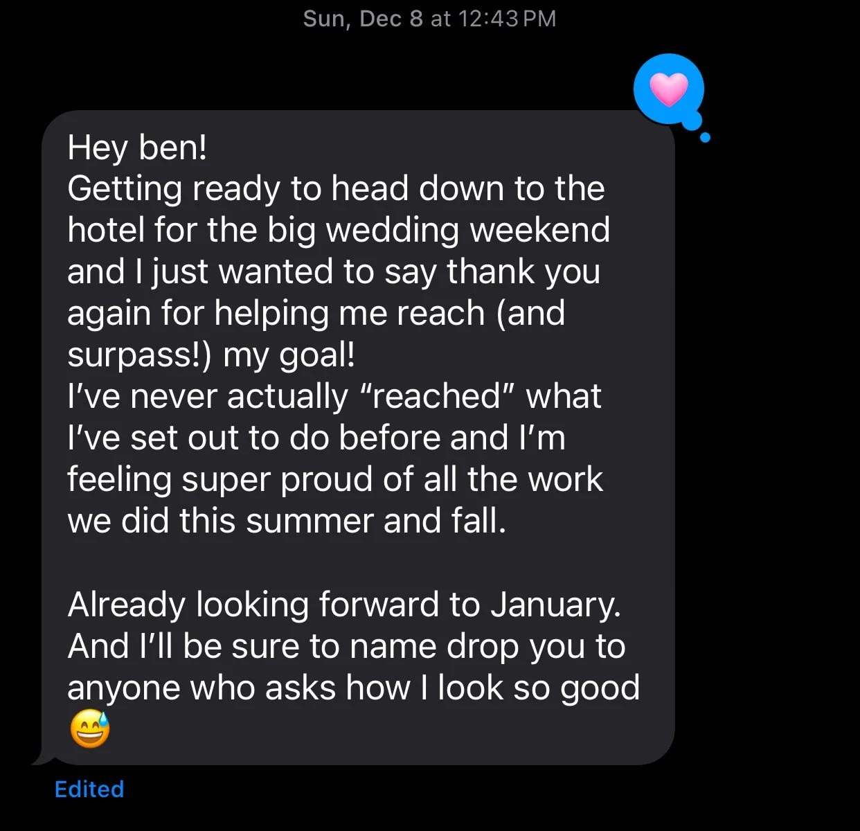 “Ben is a consummate professional. Extremely accessible and available, he will tailor a program for you and ensure that you have everything you need to successfully implement it. I cannot recommend him highly enough. If you are looking for long term, sustainable results - Ben is someone you should absolutely consider for your needs, whatever they may be.”